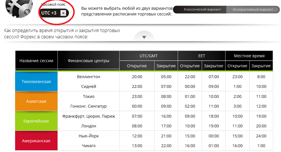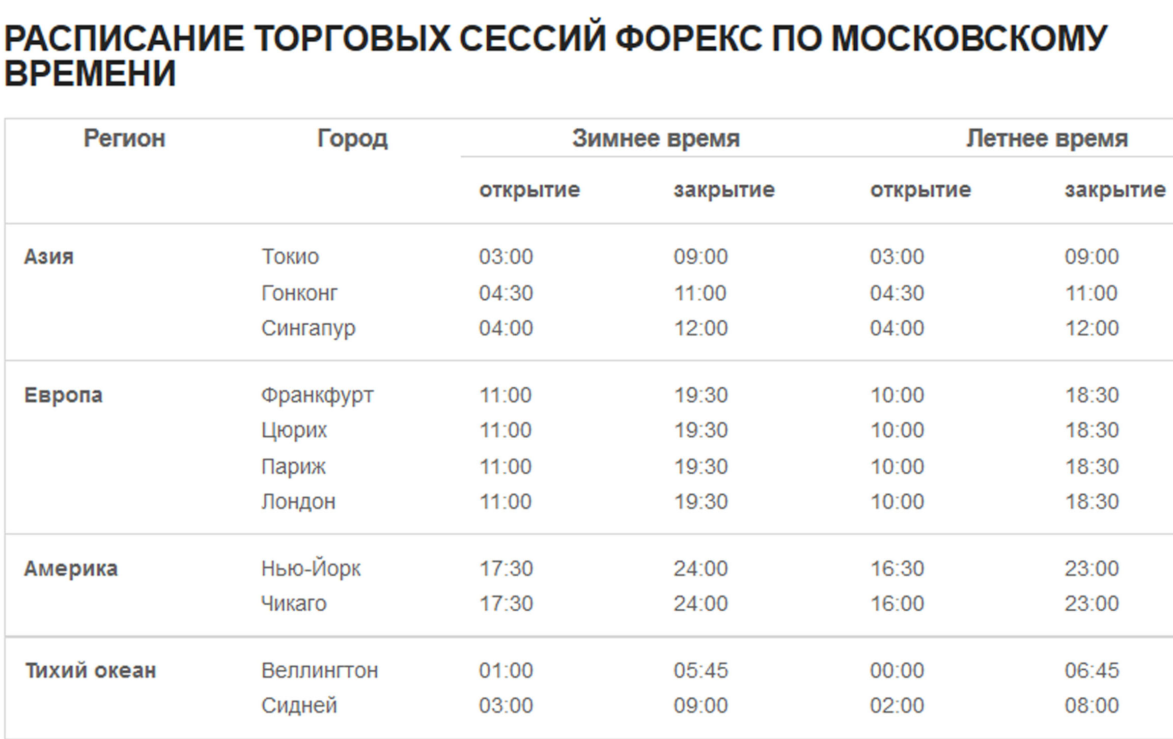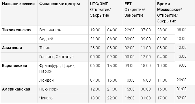 На международном валютном рынке доминирует не одна биржа, а глобальная сеть бирж и брокеров по всему миру. Торговые часы Forex основаны на том, когда торги открыты в каждой участвующей стране. Хотя часовые пояса перекрываются, общепринятые часовые пояса для каждого региона следующие: